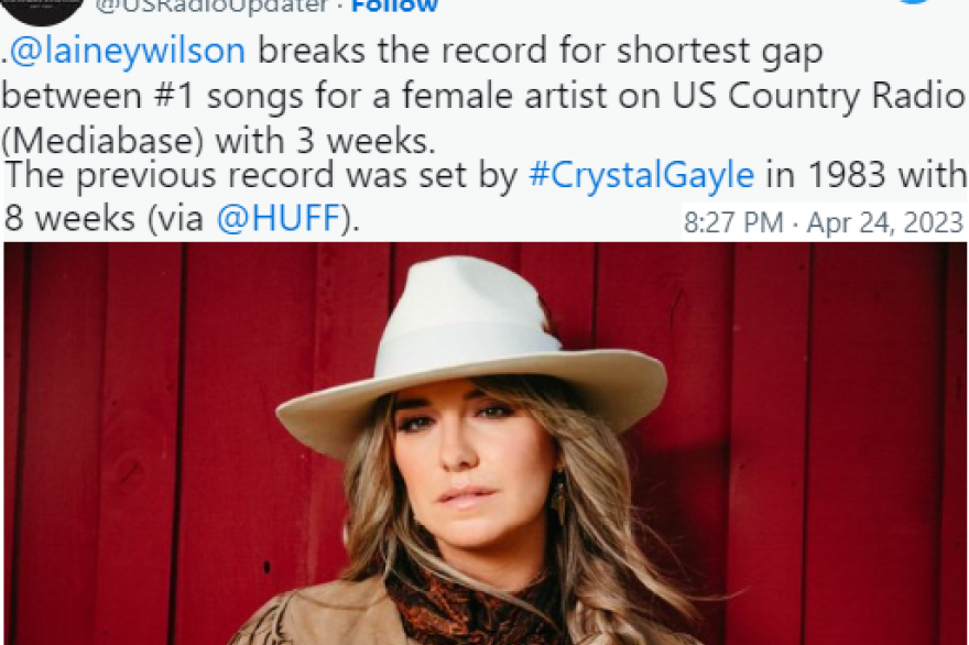 La cantautora nativa de Luisiana, USA Lainey Wilson rompe el récord de la brecha más corta entre dos éxitos n° 1 en US Country Radio.